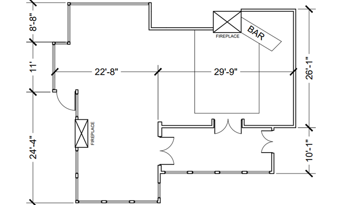 - Fireplace by bar –9.5ft wide x 5.5ft height (mantle is 2ft deep)