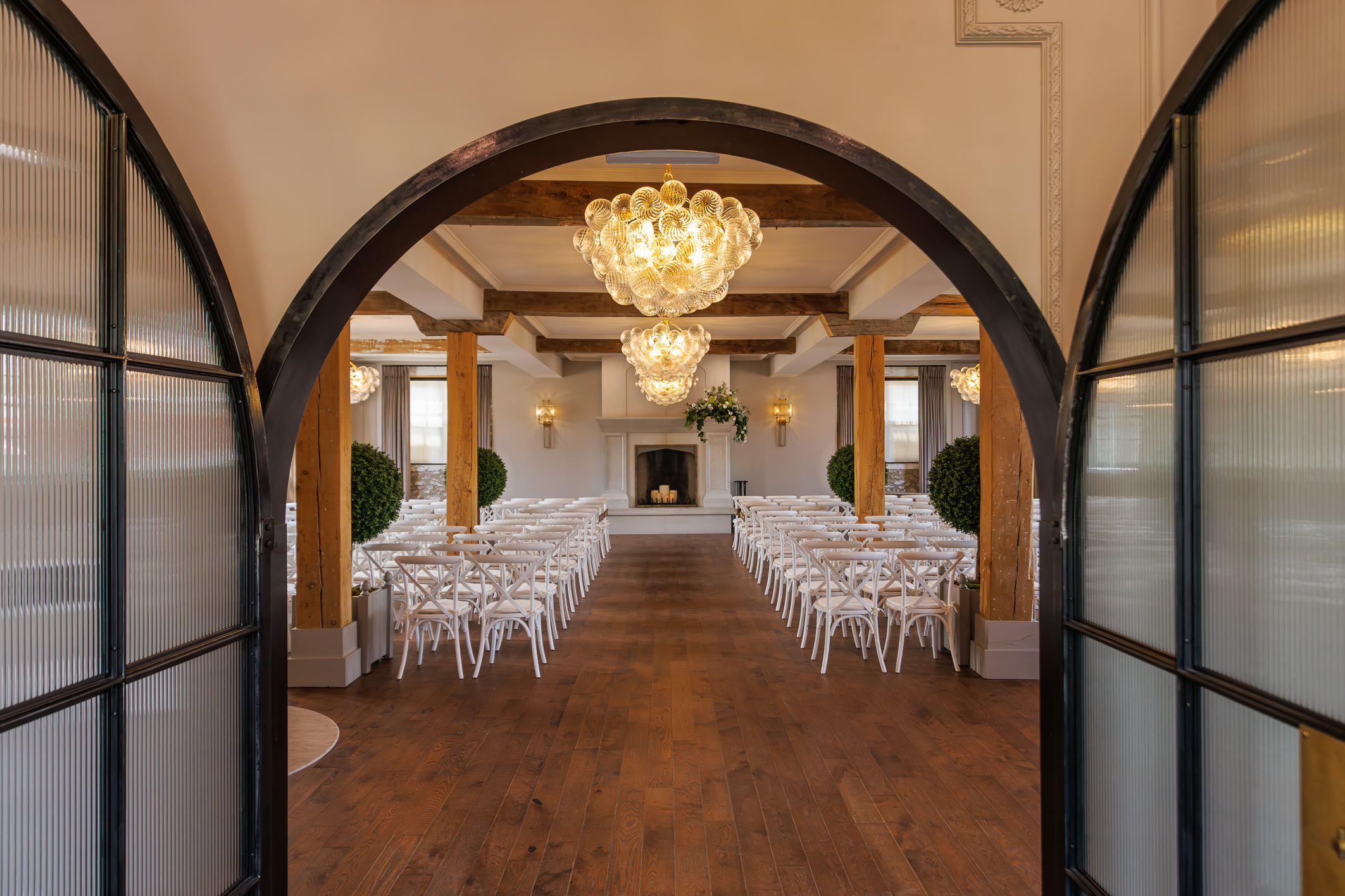 White wooden cross back chairs (10 per row), 4 reserved signs, guest washrooms, topiaries, built-in sound system with Bluetooth connection for ceremony music & microphone. Ceremony specialist to take care of AV details. Wedding Suite available 1 hour prior to the start of your ceremony. A guided rehearsal the night prior to your wedding.and cropped topiaries, this space is made to make you and your guests feel like you have arrived in an enchanting French garden.