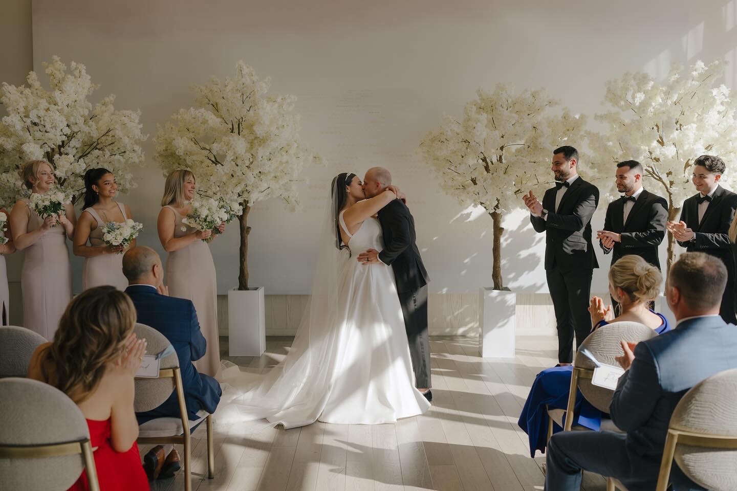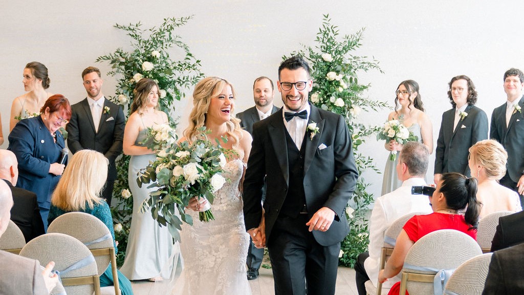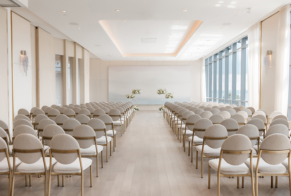 A wedding Officiant, grey and gold custom chairs, signing table, hand painted mural by a local Toronto Artist with mother of pearl embedded within, replicating the waves of Lake Ontario. Built-in sound system with Bluetooth connection for ceremony music & microphone. Ceremony specialist to take care of AV details. A guided ceremony rehearsal.