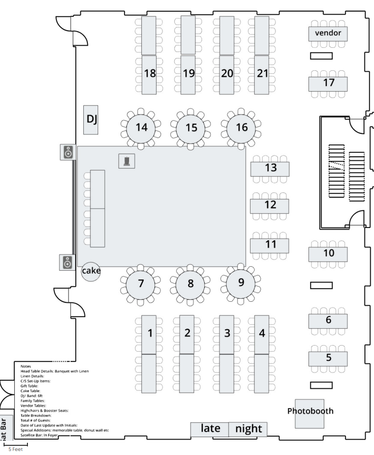 Please review custom floorplan created at the time of booking. Your consultant can provide further details on customization and head table options 6 months prior to your wedding date at your details meeting.
