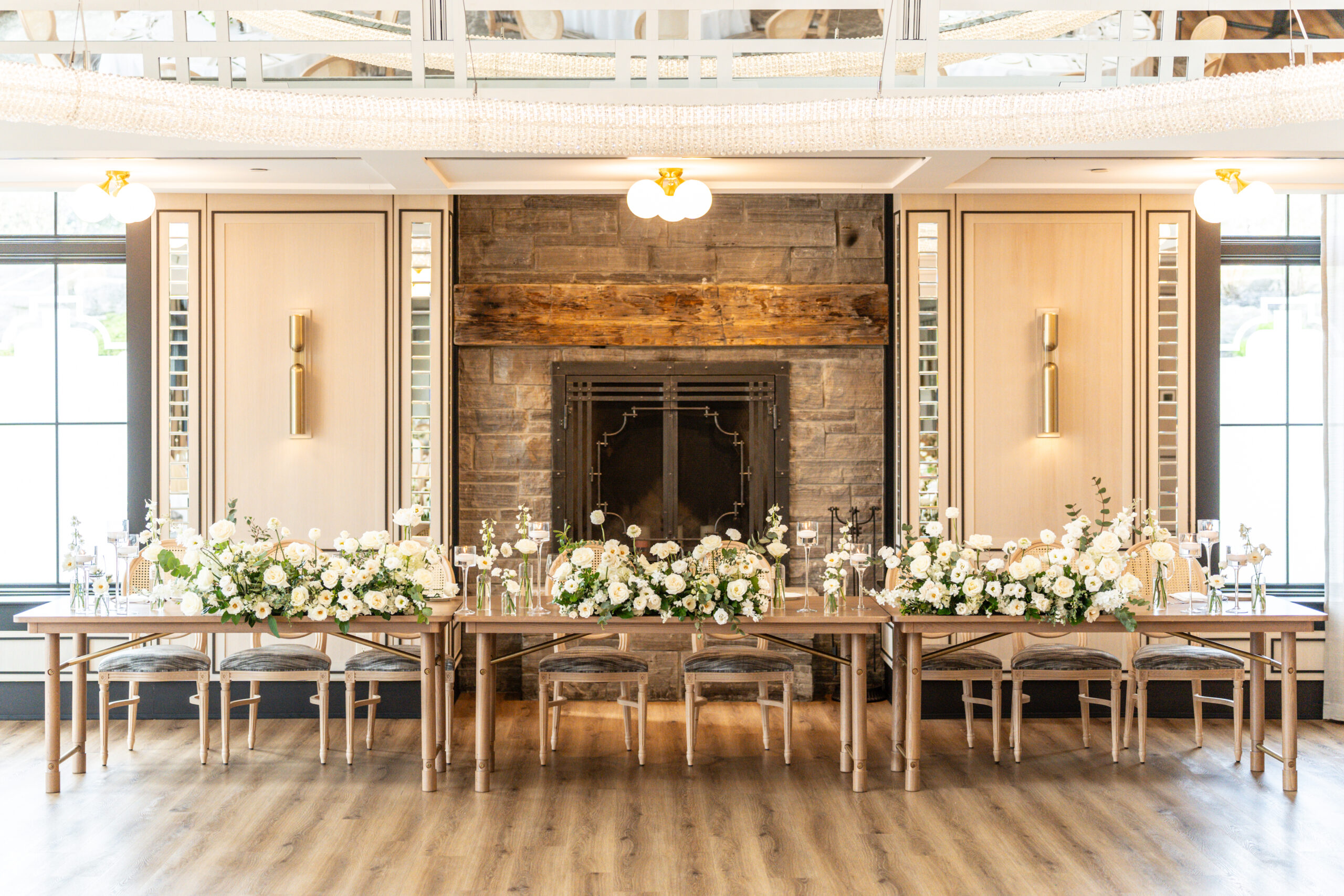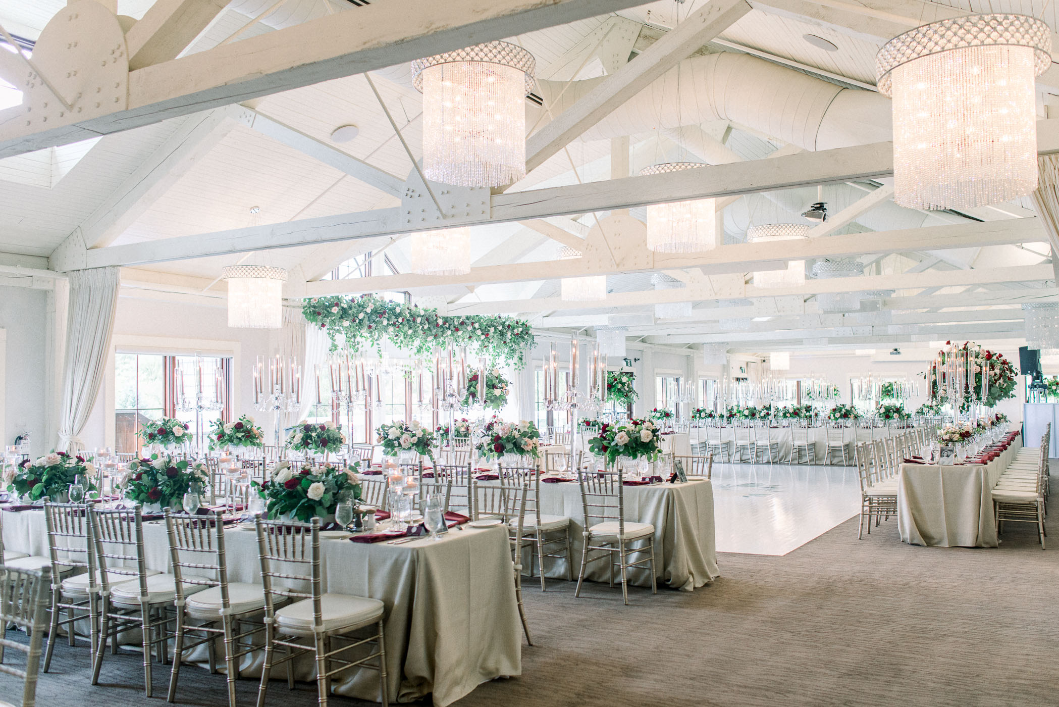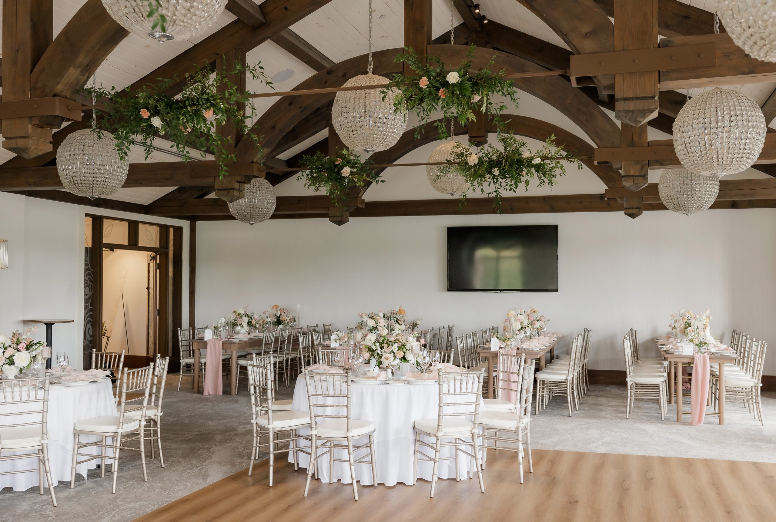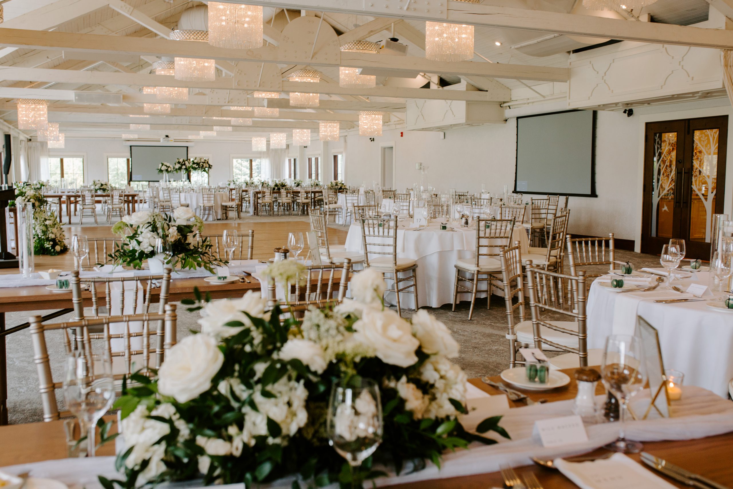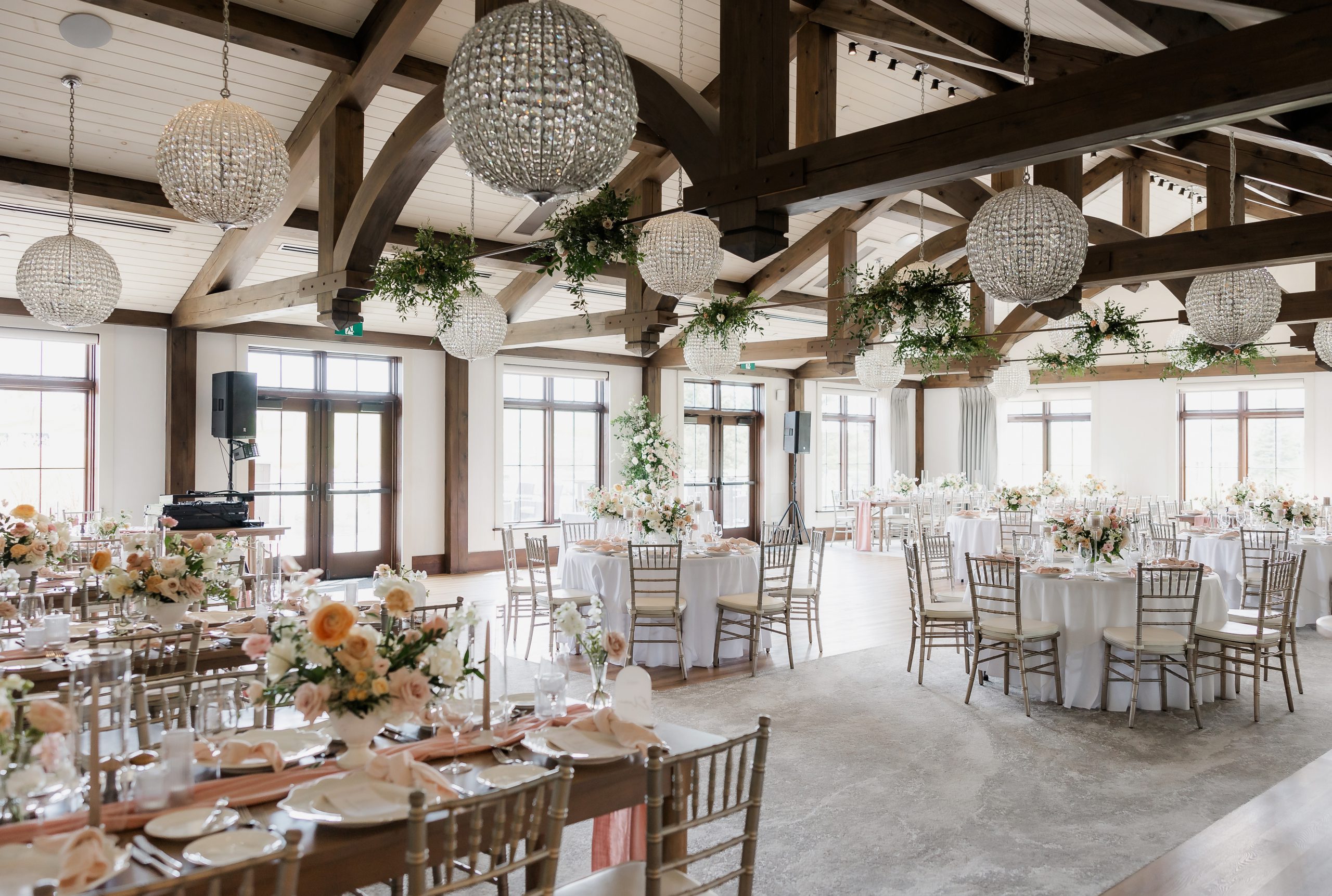 With surrounding windows, this room captures Whistle Bear’s natural landscape, while the elegant 20-foot ceiling with exposed hand-carved beams and beautiful crystal chandeliers add a romantic touch.