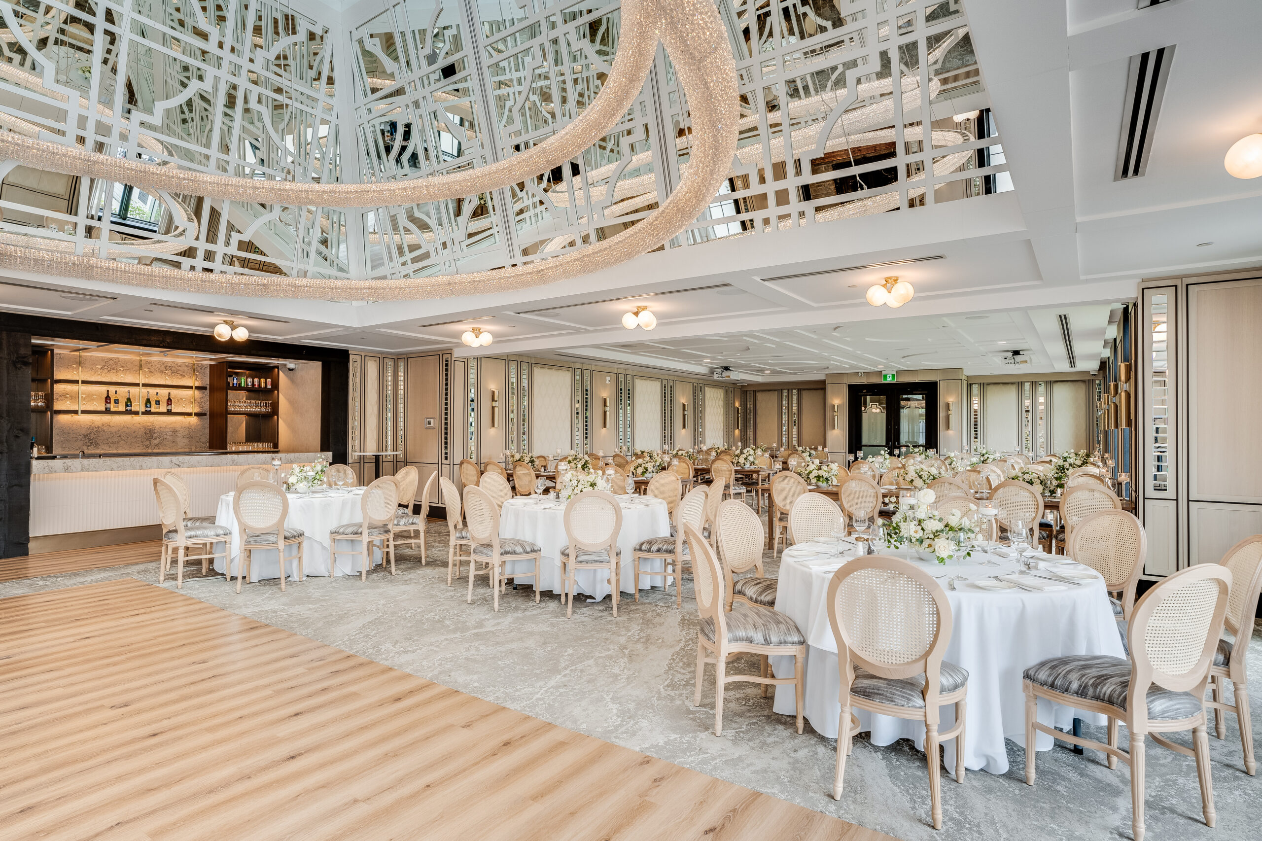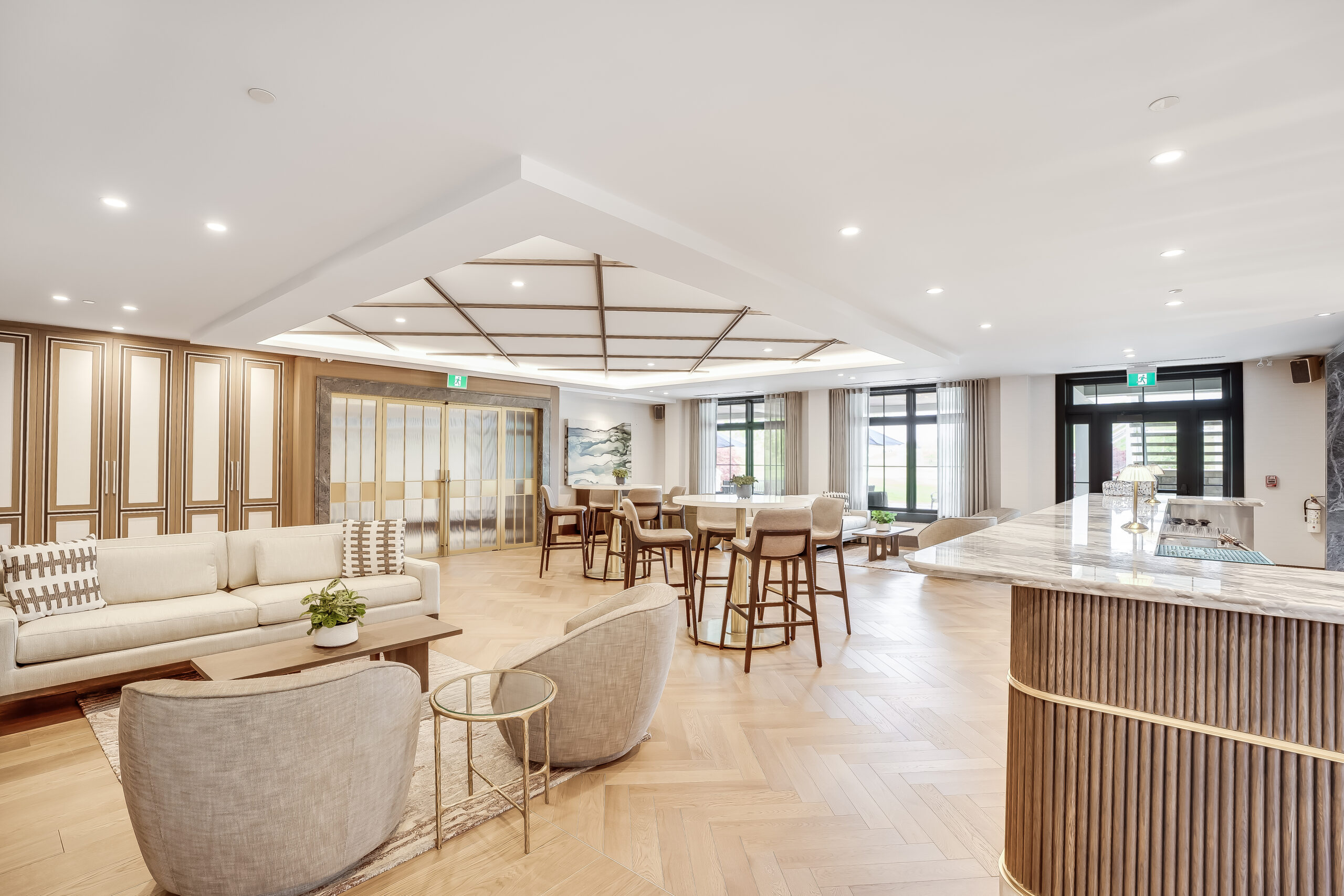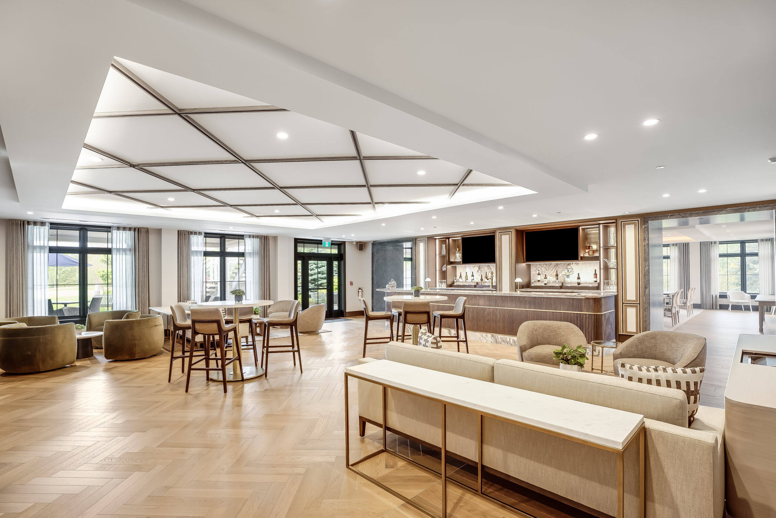 Modern sophistication and contemporary furnishings provide a stunning backdrop for hosting any intimate gathering. While windows on three sides of the room provide an airy ambiance, the feature fireplace adds luxury and comfort no matter the time of year. Complete with a custom bar and luxurious lounge furniture it is the perfect space for any event.