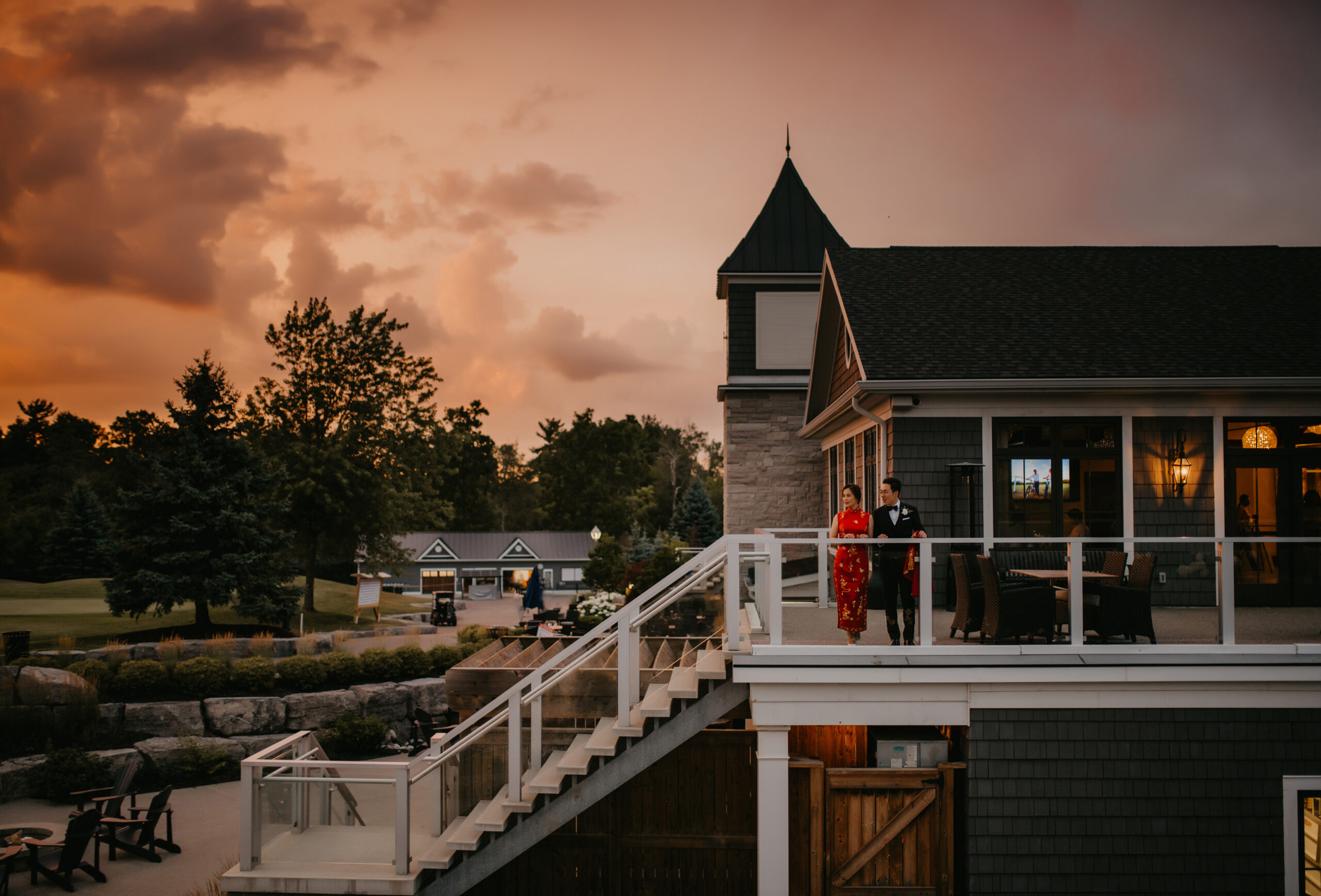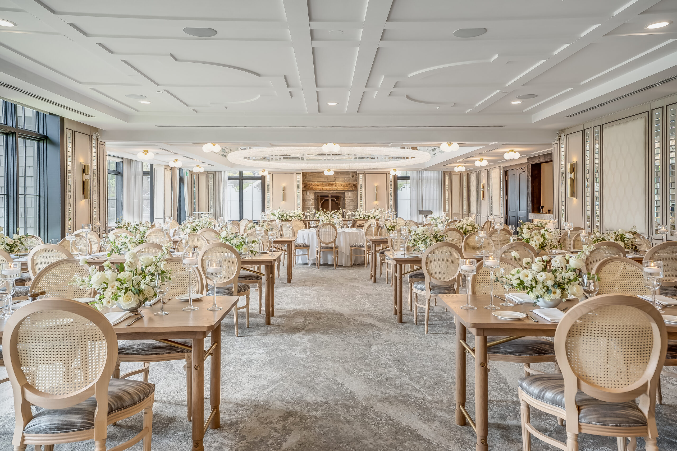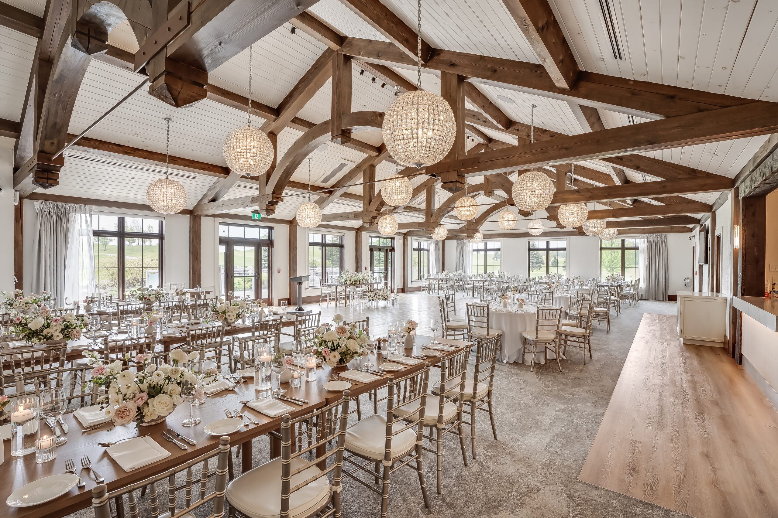 A truly grand space, the Forestview Room, with its 20-foot ceilings and exposed hand-carved pine beams, lends its splendour best to a wedding reception. Casement windows and a private terrace offer breathtaking views overlooking the golf course and a vista that includes the nearby forest and inspiring sunsets.